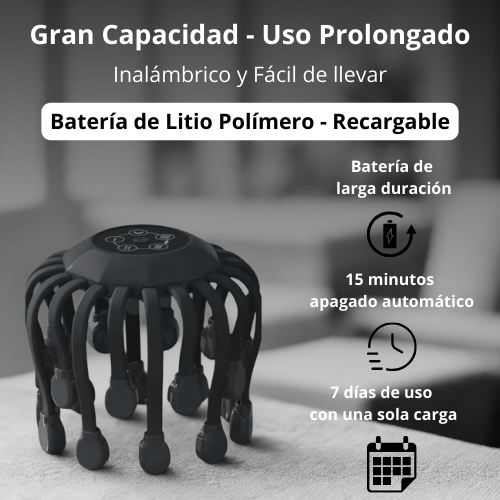 Su sistema de 20 tentáculos neurosensoriales estimula suavemente el cuero cabelludo, ayudando a relajar la mente y mejorar el bienestar general desde el primer uso.